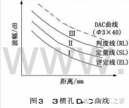 以橫坐標(biāo)表示距離(斜探頭通常表示深度,直探頭通常表示聲程),縱坐標(biāo)表示規(guī)則反射體波幅。DAC曲線只是一種特定尺寸規(guī)則反射體的曲線,如圖3所示。